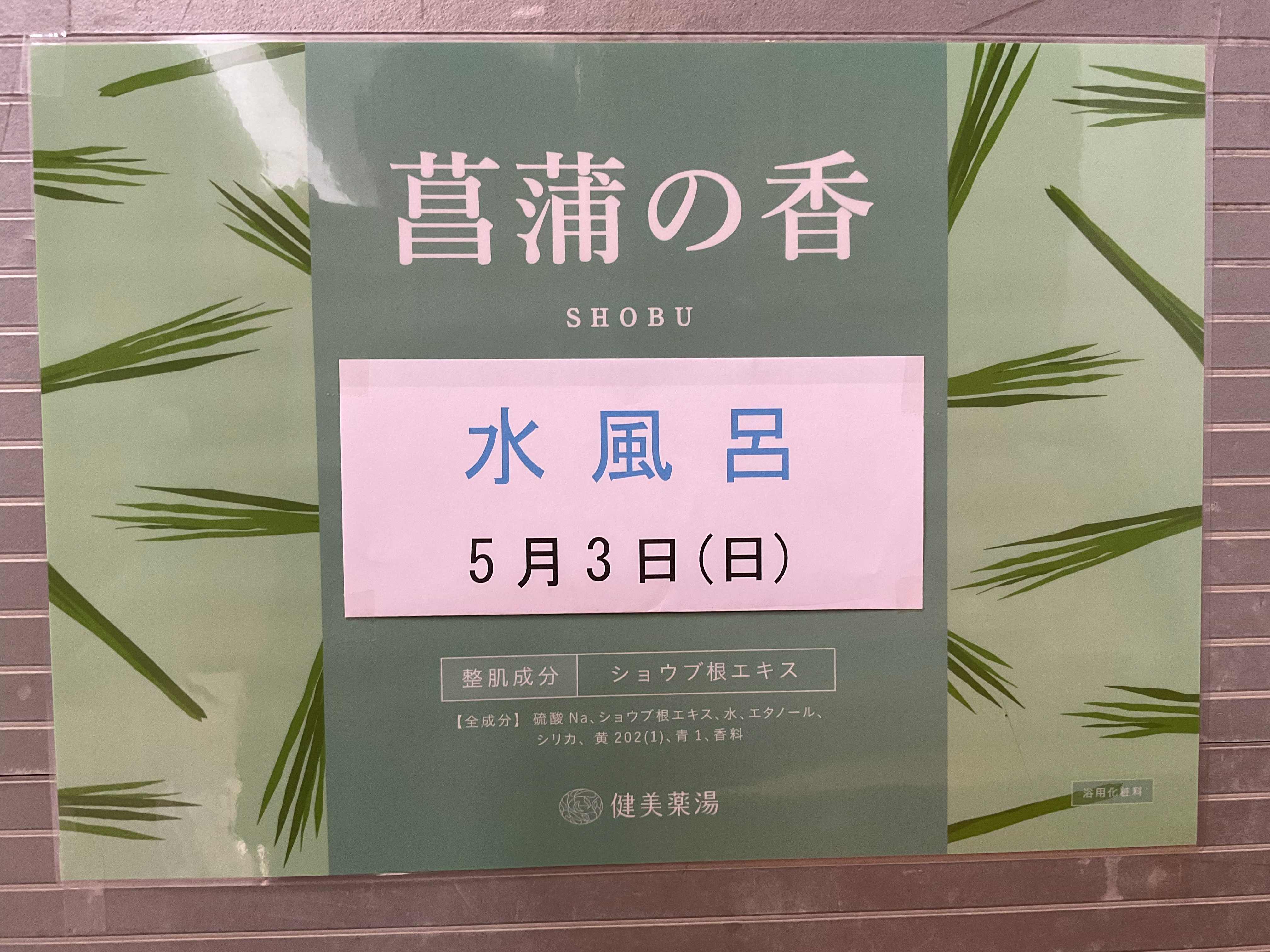 | 5月3日(日)は菖蒲の香り風呂です。 水風呂とジャグジーで実施します。菖蒲の香りで癒しのひと時を |